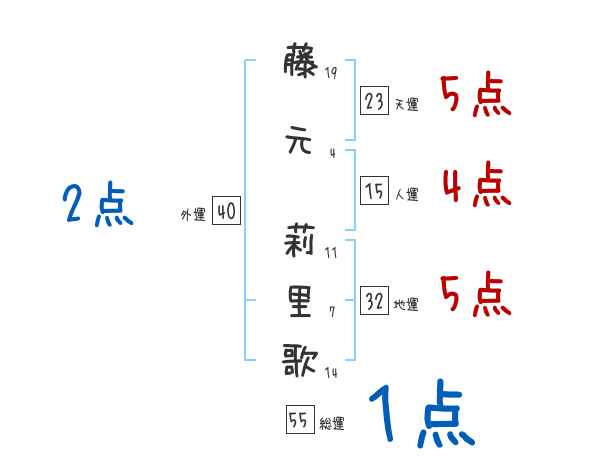 天運![]() | 藤元莉里歌さんの天運は23画の5つ星!想像力に優れ活力がある。一代で成功し名誉を手に入れる。 家系が持つ宿命的な運勢を表します。祖先から受け継いだ苗字ですので自分の力が及びません。家柄を象徴します。 |