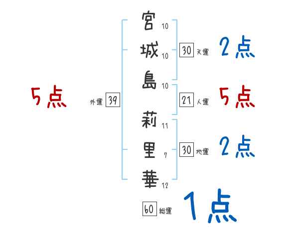 外運![]() | 宮城島莉里華さんの外運は39画の5つ星!社交性に優れ人望が厚い。人の上に立ち成功する。 生活面を象徴する運勢です。外部から受ける影響力を表し、結婚運、家庭運や職場、環境への順応性を表します。 |