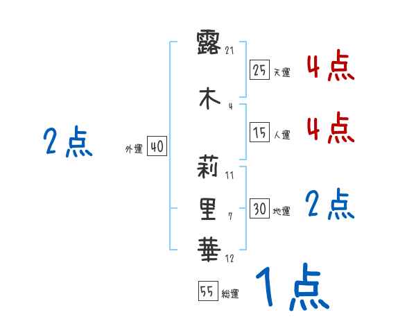 外運![]() | 露木莉里華さんの外運は40画の2つ星!自信過剰で物事に固執するためトラブルに注意。 生活面を象徴する運勢です。外部から受ける影響力を表し、結婚運、家庭運や職場、環境への順応性を表します。 |