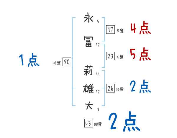 天運![]() | 永冨莉雄大さんの天運は17画の4つ星!積極的な行動力。地位を気づき財産を手に入れる。純粋な心と直感力。 家系が持つ宿命的な運勢を表します。祖先から受け継いだ苗字ですので自分の力が及びません。家柄を象徴します。 |
