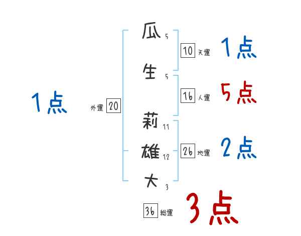 人運![]() | 瓜生莉雄大さんの人運は16画の5つ星!人望が厚く大きく発展する。逆転成功が見える。 性格や才能などを表す2番目に重要な運勢です。人間関係や協調性、社会的な成功に影響します。主に20歳から50歳ぐらいまでの中年期の運勢を表します。 |