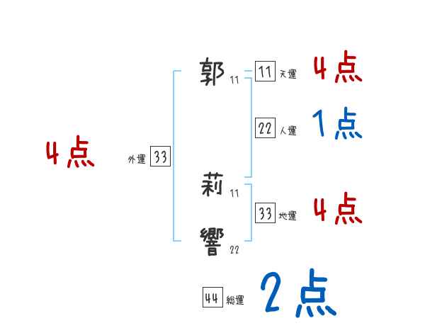 総運![]() | 郭莉響さんの総運は44画の2つ星!誠実で慎重な性格。物事を考えすぎないように注意しましょう。 あなたの人生を表す1番重要な運勢です。生涯を通じて影響する総合運となり、主に50歳以降の晩年期に影響を及ぼします。 |