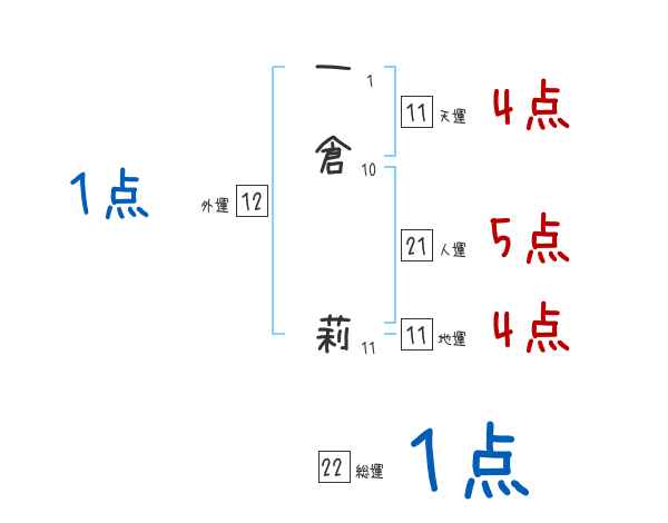 天運![]() | 一倉莉さんの天運は11画の4つ星!着実に富や地位を得る幸運な人生。 家系が持つ宿命的な運勢を表します。祖先から受け継いだ苗字ですので自分の力が及びません。家柄を象徴します。 |