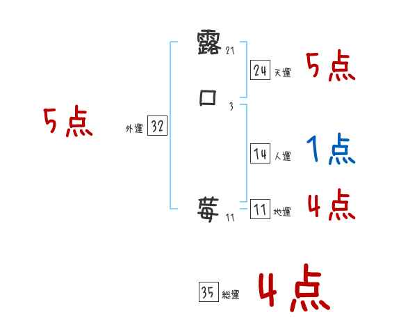 外運![]() | 露口莓さんの外運は32画の5つ星!柔軟性があり成功する。チャンスが多く金運が良い。 生活面を象徴する運勢です。外部から受ける影響力を表し、結婚運、家庭運や職場、環境への順応性を表します。 |