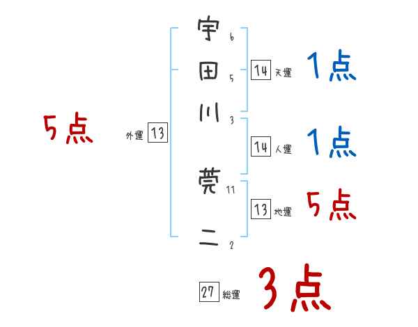 外運![]() | 宇田川莞二さんの外運は13画の5つ星!才能に恵まれ人気がある。名声を手に入れる。円満な人生。 生活面を象徴する運勢です。外部から受ける影響力を表し、結婚運、家庭運や職場、環境への順応性を表します。 |
