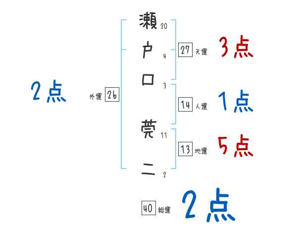 天運![]() | 瀬戸口莞二さんの天運は27画の3つ星!頭脳明晰だが強情で摩擦が多い傾向。孤立に注意。 家系が持つ宿命的な運勢を表します。祖先から受け継いだ苗字ですので自分の力が及びません。家柄を象徴します。 |