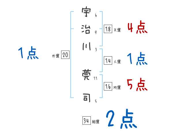 総運![]() | 宇治川莞司さんの総運は34画の2つ星!独創性に優れるが、自尊心が強く災難に注意しましょう。 あなたの人生を表す1番重要な運勢です。生涯を通じて影響する総合運となり、主に50歳以降の晩年期に影響を及ぼします。 |