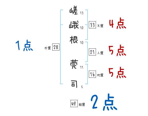 天運![]() | 嵯峨根莞司さんの天運は33画の4つ星!権力志向でプライドが高い。勇気があり運を切り開き成功する。 家系が持つ宿命的な運勢を表します。祖先から受け継いだ苗字ですので自分の力が及びません。家柄を象徴します。 |