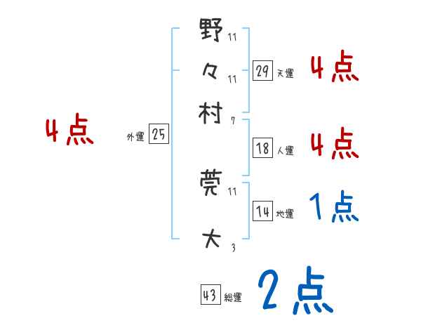 天運![]() | 野々村莞大さんの天運は29画の4つ星!完全主義で才能がある。厳格な心の持ち主。 家系が持つ宿命的な運勢を表します。祖先から受け継いだ苗字ですので自分の力が及びません。家柄を象徴します。 |