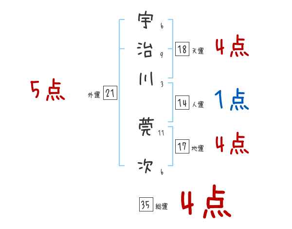 総運![]() | 宇治川莞次さんの総運は35画の4つ星!温厚な性格で感受性が高い。穏和な性格で人望が厚い。 あなたの人生を表す1番重要な運勢です。生涯を通じて影響する総合運となり、主に50歳以降の晩年期に影響を及ぼします。 |