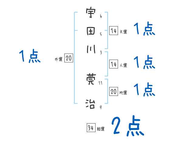 天運![]() | 宇田川莞治さんの天運は14画の1つ星!人に対して優しいがストレスを溜め込みがち。人間関係のトラブルを避けるよう気をつけましょう。 家系が持つ宿命的な運勢を表します。祖先から受け継いだ苗字ですので自分の力が及びません。家柄を象徴します。 |