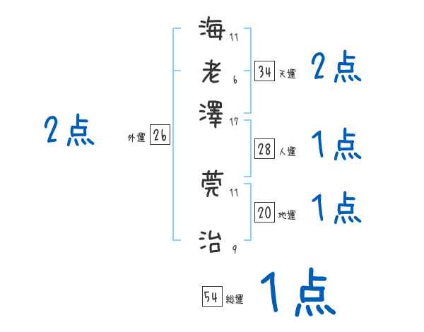 人運![]() | 海老澤莞治さんの人運は28画の1つ星!家庭環境に注意。スポーツで活躍できる能力があるかも。 性格や才能などを表す2番目に重要な運勢です。人間関係や協調性、社会的な成功に影響します。主に20歳から50歳ぐらいまでの中年期の運勢を表します。 |