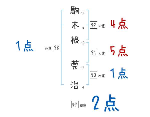 天運![]() | 駒木根莞治さんの天運は29画の4つ星!完全主義で才能がある。厳格な心の持ち主。 家系が持つ宿命的な運勢を表します。祖先から受け継いだ苗字ですので自分の力が及びません。家柄を象徴します。 |
