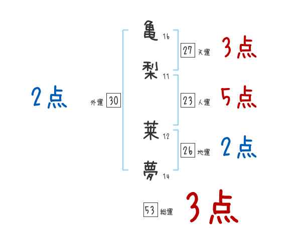 外運![]() | 亀梨莱夢さんの外運は30画の2つ星!浮き沈みの激しさに注意しましょう。 生活面を象徴する運勢です。外部から受ける影響力を表し、結婚運、家庭運や職場、環境への順応性を表します。 |