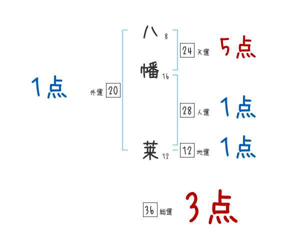 天運![]() | 八幡莱さんの天運は24画の5つ星!家庭運が良く順調な人生。金運にも恵まれる。 家系が持つ宿命的な運勢を表します。祖先から受け継いだ苗字ですので自分の力が及びません。家柄を象徴します。 |
