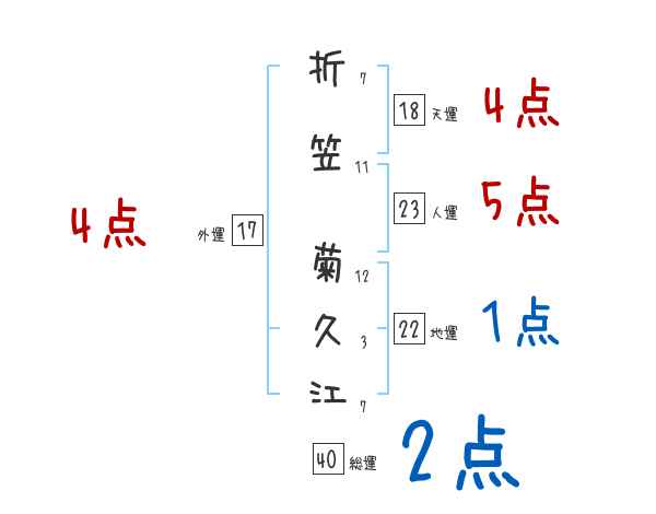 天運![]() | 折笠菊久江さんの天運は18画の4つ星!情熱的で剛気。忍耐力があり信頼される。 家系が持つ宿命的な運勢を表します。祖先から受け継いだ苗字ですので自分の力が及びません。家柄を象徴します。 |