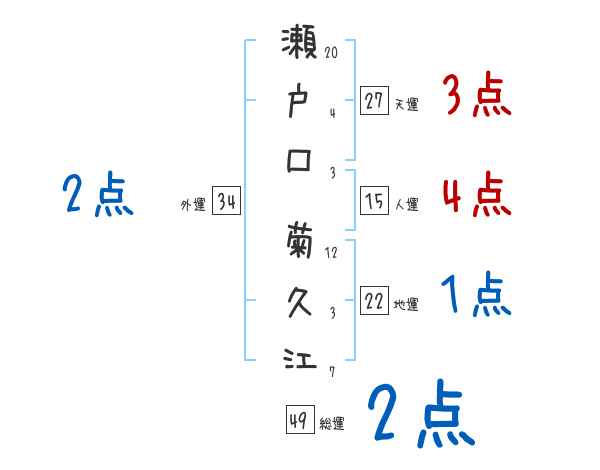 外運![]() | 瀬戸口菊久江さんの外運は34画の2つ星!独創性に優れるが、自尊心が強く災難に注意しましょう。 生活面を象徴する運勢です。外部から受ける影響力を表し、結婚運、家庭運や職場、環境への順応性を表します。 |