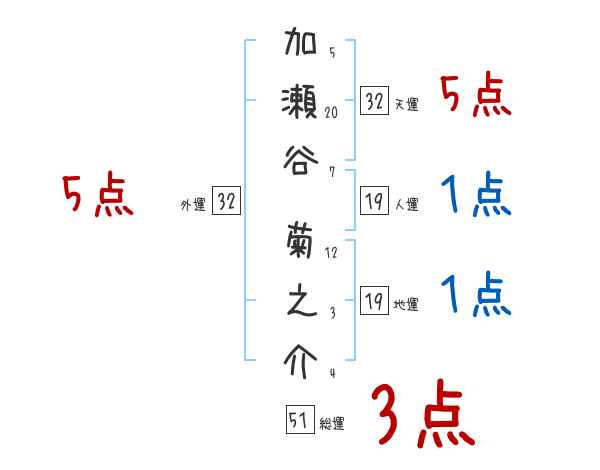 外運![]() | 加瀬谷菊之介さんの外運は32画の5つ星!柔軟性があり成功する。チャンスが多く金運が良い。 生活面を象徴する運勢です。外部から受ける影響力を表し、結婚運、家庭運や職場、環境への順応性を表します。 |