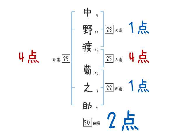 天運![]() | 中野渡菊之助さんの天運は28画の1つ星!家庭環境に注意。スポーツで活躍できる能力があるかも。 家系が持つ宿命的な運勢を表します。祖先から受け継いだ苗字ですので自分の力が及びません。家柄を象徴します。 |