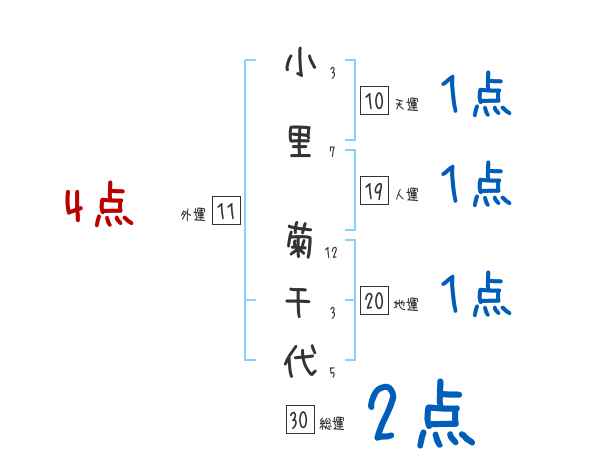 天運![]() | 小里菊千代さんの天運は10画の1つ星!不安を感じやすい傾向。ストレスを抱えないように注意しましょう。 家系が持つ宿命的な運勢を表します。祖先から受け継いだ苗字ですので自分の力が及びません。家柄を象徴します。 |