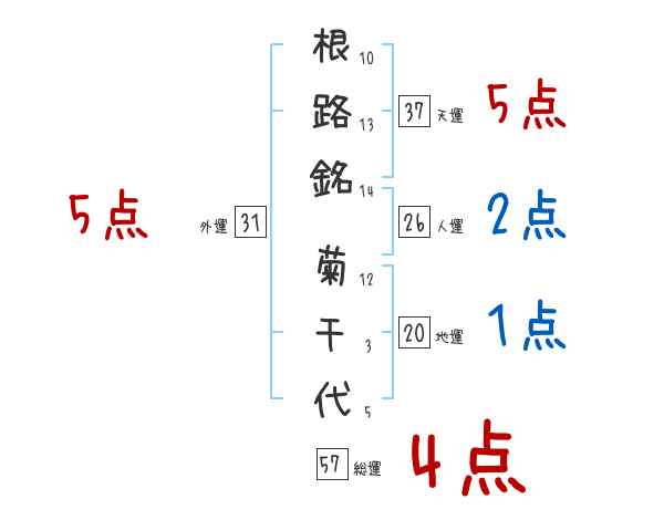 総運![]() | 根路銘菊千代さんの総運は57画の4つ星!向上心があり人望がある。地位を得る。 あなたの人生を表す1番重要な運勢です。生涯を通じて影響する総合運となり、主に50歳以降の晩年期に影響を及ぼします。 |