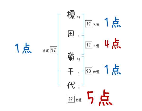 総運![]() | 榎田菊千代さんの総運は39画の5つ星!社交性に優れ人望が厚い。人の上に立ち成功する。 あなたの人生を表す1番重要な運勢です。生涯を通じて影響する総合運となり、主に50歳以降の晩年期に影響を及ぼします。 |