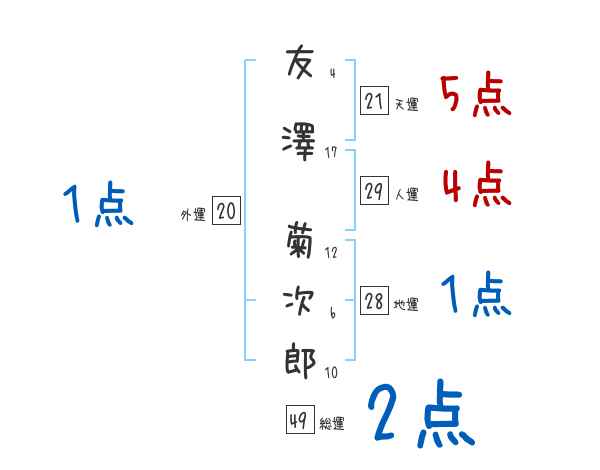 天運![]() | 友澤菊次郎さんの天運は21画の5つ星!統率力がある。独立し成功する。名誉を手に入れる。 家系が持つ宿命的な運勢を表します。祖先から受け継いだ苗字ですので自分の力が及びません。家柄を象徴します。 |