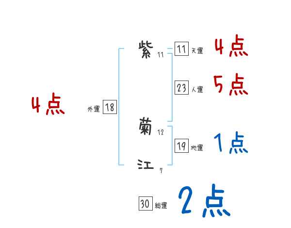 人運![]() | 紫菊江さんの人運は23画の5つ星!想像力に優れ活力がある。一代で成功し名誉を手に入れる。 性格や才能などを表す2番目に重要な運勢です。人間関係や協調性、社会的な成功に影響します。主に20歳から50歳ぐらいまでの中年期の運勢を表します。 |