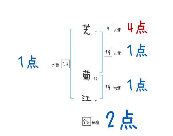 天運![]() | 芝菊江さんの天運は7画の4つ星!強い意志や信念を持ち独立心が強い。自立する。 家系が持つ宿命的な運勢を表します。祖先から受け継いだ苗字ですので自分の力が及びません。家柄を象徴します。 |