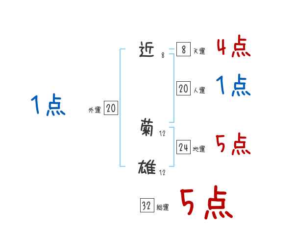 総運![]() | 近菊雄さんの総運は32画の5つ星!柔軟性があり成功する。チャンスが多く金運が良い。 あなたの人生を表す1番重要な運勢です。生涯を通じて影響する総合運となり、主に50歳以降の晩年期に影響を及ぼします。 |
