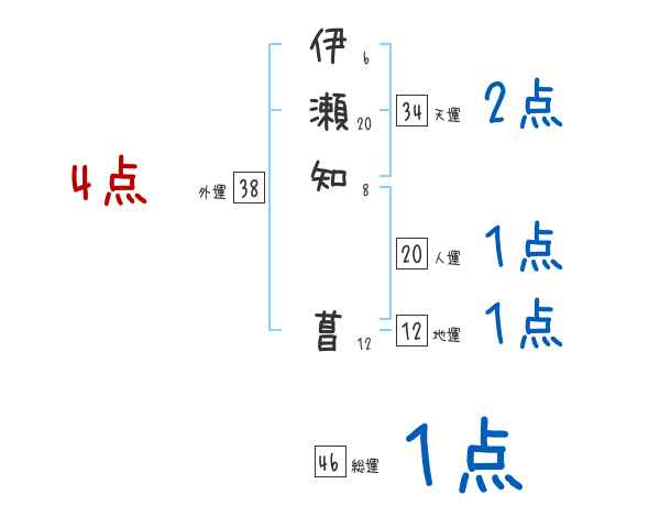 総運![]() | 伊瀬知菖さんの総運は46画の1つ星!迷走することが多く苦労するかも。目先のことにとらわれないように。 あなたの人生を表す1番重要な運勢です。生涯を通じて影響する総合運となり、主に50歳以降の晩年期に影響を及ぼします。 |
