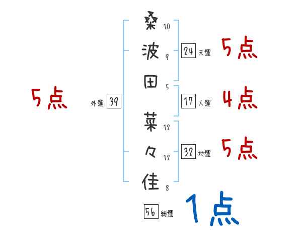 外運![]() | 桑波田菜々佳さんの外運は39画の5つ星!社交性に優れ人望が厚い。人の上に立ち成功する。 生活面を象徴する運勢です。外部から受ける影響力を表し、結婚運、家庭運や職場、環境への順応性を表します。 |