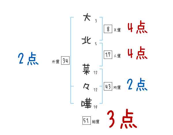 天運![]() | 大北菜々嘩さんの天運は8画の4つ星!勤勉家。根気強く努力し成功する。忍耐力がある。 家系が持つ宿命的な運勢を表します。祖先から受け継いだ苗字ですので自分の力が及びません。家柄を象徴します。 |