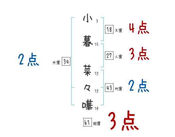 天運![]() | 小暮菜々嘩さんの天運は18画の4つ星!情熱的で剛気。忍耐力があり信頼される。 家系が持つ宿命的な運勢を表します。祖先から受け継いだ苗字ですので自分の力が及びません。家柄を象徴します。 |