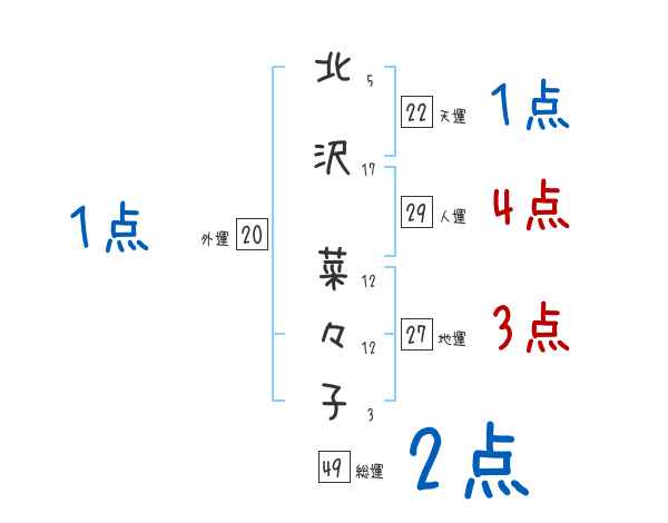 天運![]() | 北沢菜々子さんの天運は22画の1つ星!努力することが苦手ないっぽう手先が器用。芸術性にも優れる。 家系が持つ宿命的な運勢を表します。祖先から受け継いだ苗字ですので自分の力が及びません。家柄を象徴します。 |