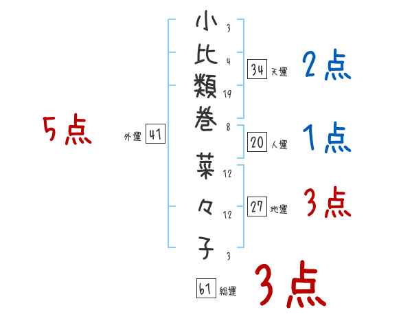 天運![]() | 小比類巻菜々子さんの天運は34画の2つ星!独創性に優れるが、自尊心が強く災難に注意しましょう。 家系が持つ宿命的な運勢を表します。祖先から受け継いだ苗字ですので自分の力が及びません。家柄を象徴します。 |
