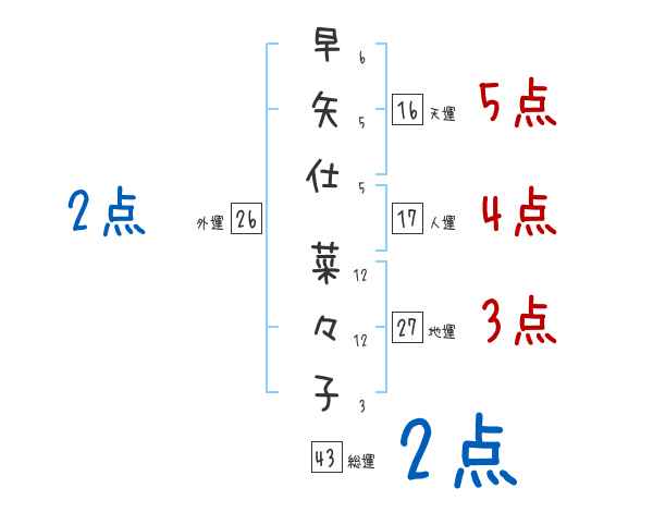 外運![]() | 早矢仕菜々子さんの外運は26画の2つ星!波瀾万丈かも。信頼できる人を大事にしましょう。 生活面を象徴する運勢です。外部から受ける影響力を表し、結婚運、家庭運や職場、環境への順応性を表します。 |