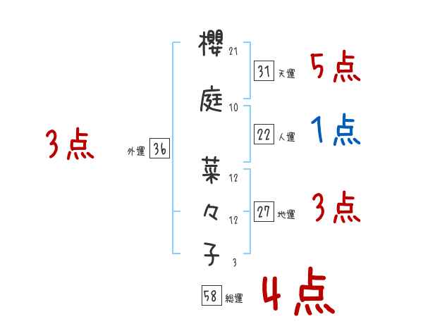 総運![]() | 櫻庭菜々子さんの総運は58画の4つ星!安定した生活。大器晩成タイプ。 あなたの人生を表す1番重要な運勢です。生涯を通じて影響する総合運となり、主に50歳以降の晩年期に影響を及ぼします。 |