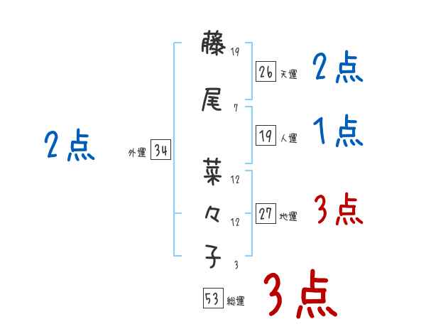 総運![]() | 藤尾菜々子さんの総運は53画の3つ星!やや見栄っ張りで虚栄心がある。散財に注意。 あなたの人生を表す1番重要な運勢です。生涯を通じて影響する総合運となり、主に50歳以降の晩年期に影響を及ぼします。 |