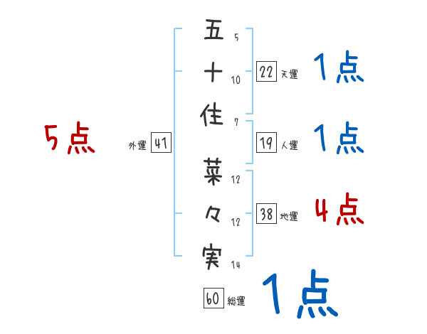 外運![]() | 五十住菜々実さんの外運は41画の5つ星!大志を抱き、目標に向かって実力を発揮し達成する。温和な性格。 生活面を象徴する運勢です。外部から受ける影響力を表し、結婚運、家庭運や職場、環境への順応性を表します。 |