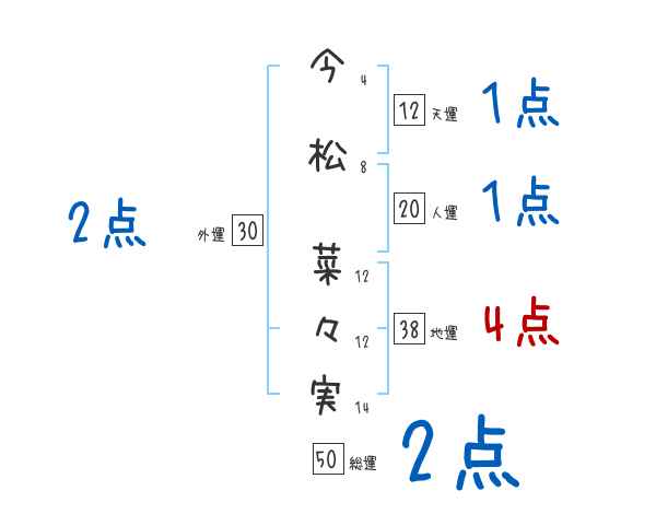 総運![]() | 今松菜々実さんの総運は50画の2つ星!浮き沈みが激しく不安定。しりすぼみに衰退しやすいので注意しましょう。 あなたの人生を表す1番重要な運勢です。生涯を通じて影響する総合運となり、主に50歳以降の晩年期に影響を及ぼします。 |