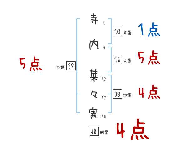 外運![]() | 寺内菜々実さんの外運は32画の5つ星!柔軟性があり成功する。チャンスが多く金運が良い。 生活面を象徴する運勢です。外部から受ける影響力を表し、結婚運、家庭運や職場、環境への順応性を表します。 |