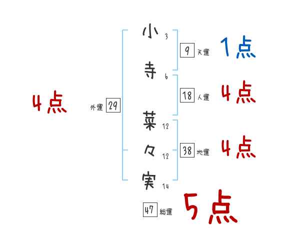 総運![]() | 小寺菜々実さんの総運は47画の5つ星!実力が開花し発展する円満な人生。財に恵まれる。 あなたの人生を表す1番重要な運勢です。生涯を通じて影響する総合運となり、主に50歳以降の晩年期に影響を及ぼします。 |