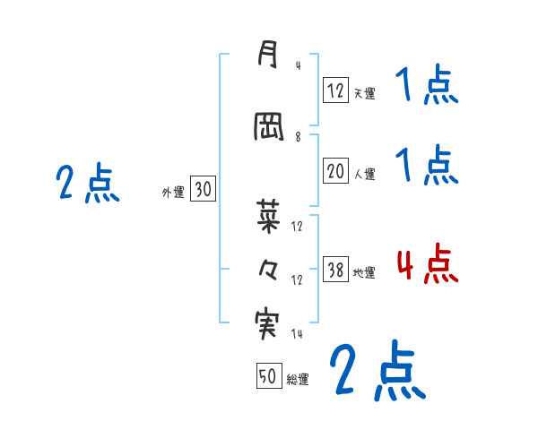 総運![]() | 月岡菜々実さんの総運は50画の2つ星!浮き沈みが激しく不安定。しりすぼみに衰退しやすいので注意しましょう。 あなたの人生を表す1番重要な運勢です。生涯を通じて影響する総合運となり、主に50歳以降の晩年期に影響を及ぼします。 |