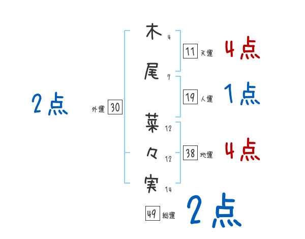 天運![]() | 木尾菜々実さんの天運は11画の4つ星!着実に富や地位を得る幸運な人生。 家系が持つ宿命的な運勢を表します。祖先から受け継いだ苗字ですので自分の力が及びません。家柄を象徴します。 |