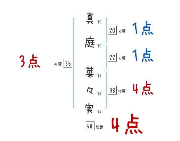 外運![]() | 真庭菜々実さんの外運は36画の3つ星!先見性が豊かです。多少神経質で苦労することも。 生活面を象徴する運勢です。外部から受ける影響力を表し、結婚運、家庭運や職場、環境への順応性を表します。 |