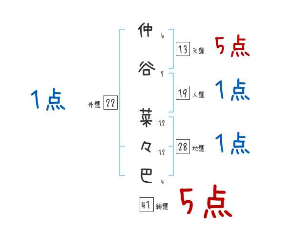 外運![]() | 仲谷菜々巴さんの外運は22画の1つ星!努力することが苦手ないっぽう手先が器用。芸術性にも優れる。 生活面を象徴する運勢です。外部から受ける影響力を表し、結婚運、家庭運や職場、環境への順応性を表します。 |