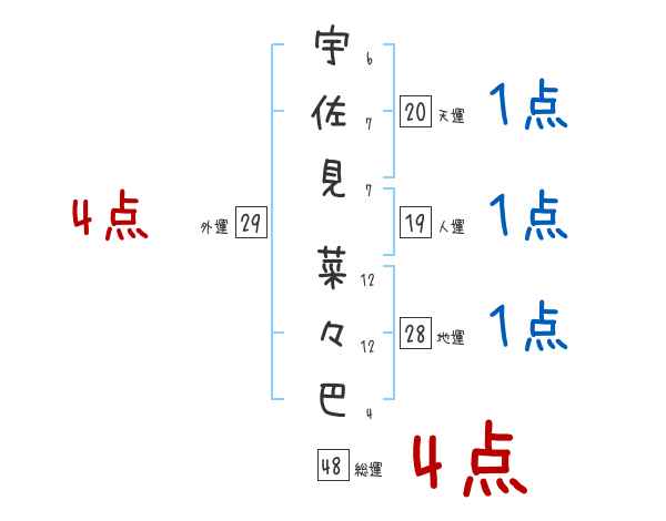 外運![]() | 宇佐見菜々巴さんの外運は29画の4つ星!完全主義で才能がある。厳格な心の持ち主。 生活面を象徴する運勢です。外部から受ける影響力を表し、結婚運、家庭運や職場、環境への順応性を表します。 |