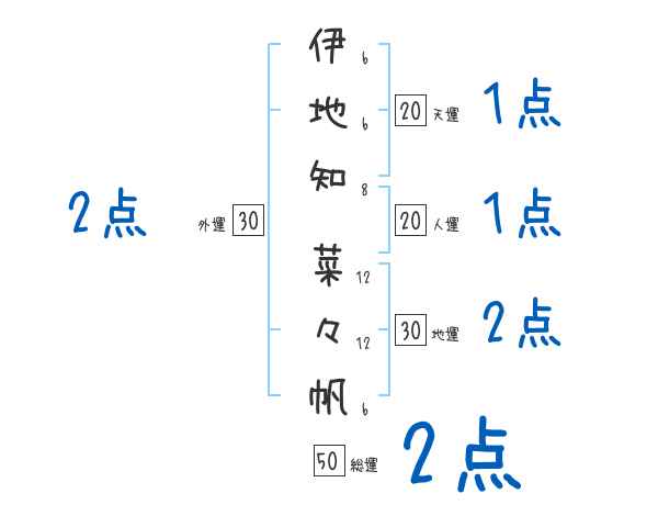 総運![]() | 伊地知菜々帆さんの総運は50画の2つ星!浮き沈みが激しく不安定。しりすぼみに衰退しやすいので注意しましょう。 あなたの人生を表す1番重要な運勢です。生涯を通じて影響する総合運となり、主に50歳以降の晩年期に影響を及ぼします。 |