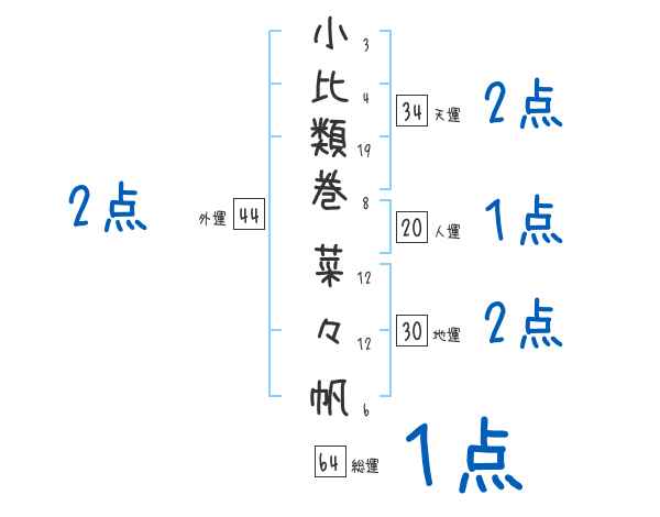 外運![]() | 小比類巻菜々帆さんの外運は44画の2つ星!誠実で慎重な性格。物事を考えすぎないように注意しましょう。 生活面を象徴する運勢です。外部から受ける影響力を表し、結婚運、家庭運や職場、環境への順応性を表します。 |